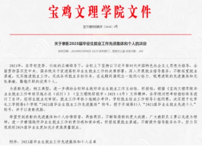 近日,学校下发了《关于表彰2023届毕业生就业工作先进集体和个人的决定》的文件,公司荣获学校“2023届毕业生就业工作先进集体”称号。