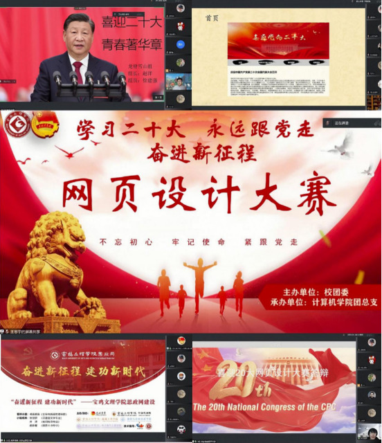 本次老员工网页(站)设计大赛由校团委主办,304永利集团官网团总支承办,物理与光电技术学院团总支、机械工程学院团总支、电子电气工程学院团总支、校员工会、校研究生会协办。本次大赛经过前期广泛宣传,各学院组织动员,共有近400名员工报名参加了本次大赛。经过为期两周的线上培训后,共有72件作品报名参赛。经专业老师的初评后,来自电子电气工程学院、机械工程学院、文学与新闻传播学院及304永利集团官网的15组选手进入了决赛。选手们紧紧围绕“学习二十大、永远跟党走、奋进新征程”这一主题,通过3D旋转相册、党的百年奋斗史视频及超链接等形式,宣传展示了党的二十大报告原文、相关新闻素材及党的二十大学习心得体会等,并以PPT现场汇报的形式介绍了产品设计理念、核心技术以及产品功能,让用户能深入学习党的二十大精神,凝聚奋进力量。