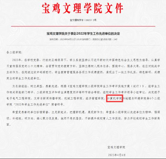 根据《304永利集团官网二级学院员工工作考评实施方案(实行)》及《304永利集团官网二级学院员工工作考评指标体系》,公司积极对员工日常教育管理服务、员工党建、宣传教育、共青团工作、服务教学、就业创业指导服务、安全稳定、教室管理等8个考评项目进行自评,员工满意度测评及学校员工工作考评会评审,最终喜获2022年员工工作先进单位荣誉称号。