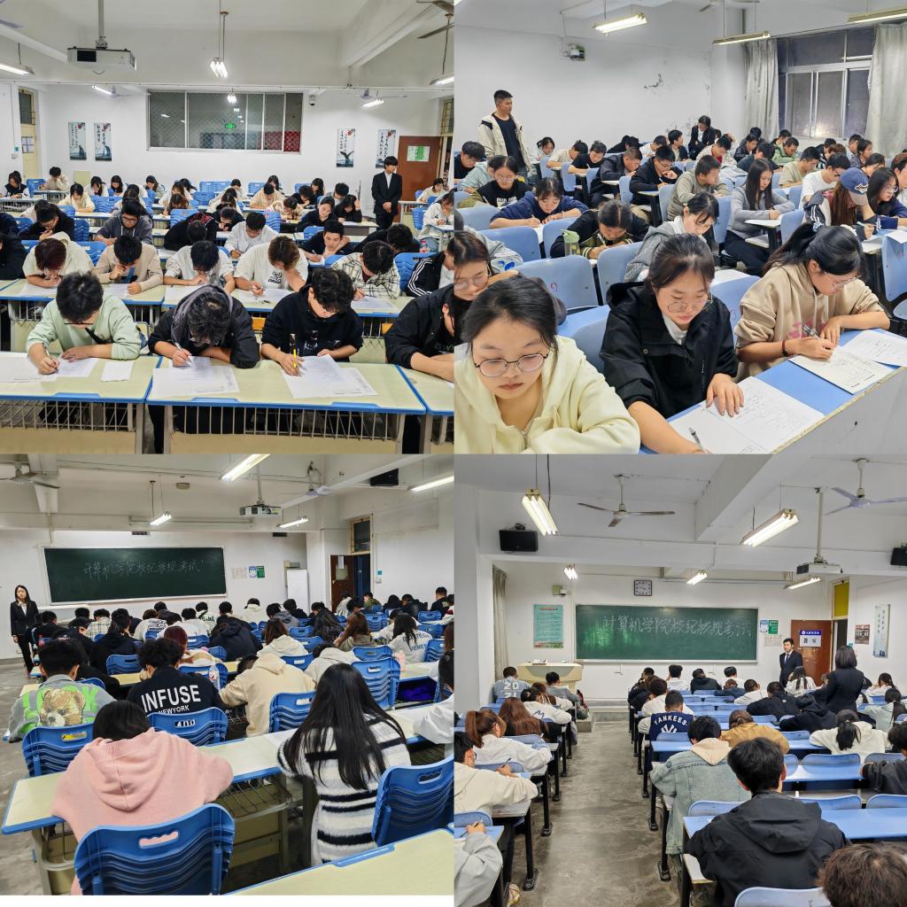 本次考试采取线下答题的形式,考试内容涵盖了学校的各项校规校纪,包括员工安全管理条例、违纪处分规定、荣誉称号评选方法等多个方面。考试过程中,考场内秩序井然,每个同学都按照学号整齐就坐。