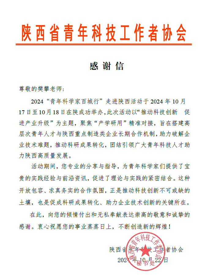 10月17日至18日,由中国青年科技工作者协会指导,共青团陕西省委、陕西省青联主办的2024“青年科学家百城行”走进陕西活动在宝鸡市成功举办。公司教师樊攀积极参与,围绕活动主题分享专业经验与技术见解,促进了理论与实践的紧密结合,助力政产学研用协同发展。活动结束后,樊攀收到陕西省青年科技工作者协会的感谢信,肯定其在活动中的突出贡献。