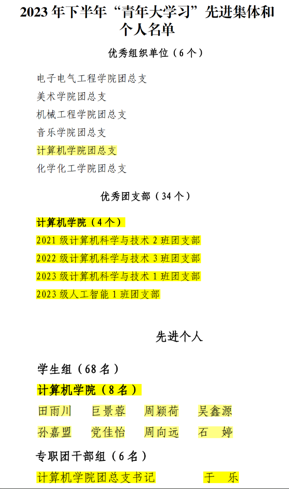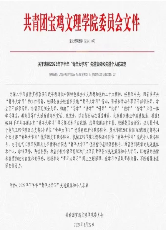 近日,校团委印发了《关于表彰2023年下半年“青年大学习”先进集体和先进个人的决定》,公司团总支荣获“青年大学习”优秀组织单位荣誉称号;2021 级计算机科学与技术 2 班等4个团支部荣获“青年大学习”优秀团支部荣誉称号;田雨川等8名同学荣获“青年大学习”先进个人荣誉称号;公司团总支书记于乐获“青年大学习”优秀指导老师荣誉称号。
