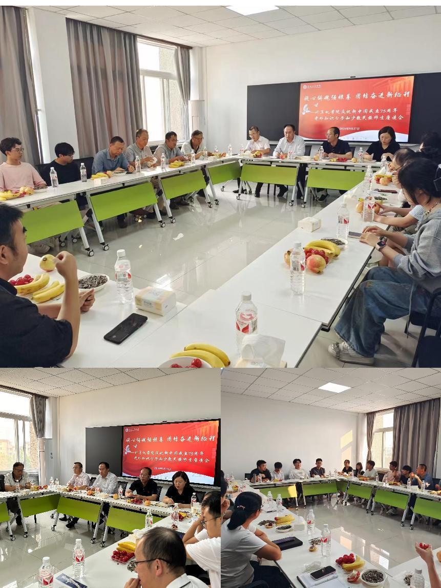 座谈交流中,与会师生紧紧围绕“凝心铸魂强根基 团结奋进新征程”的主题踊跃发言。少数民族教师代表李亚峰表示,今后将以习近平新时代中国特色社会主义思想为指导,立足教书育人的本职工作,结合学科特点做好优秀传统文化的挖掘、弘扬和创新,培养具有坚定文化自信的优秀人才,铸牢中华民族共同体的主线意识,为强国建设、民族复兴凝聚磅礴力量。无党派教师代表黄天良表示,在今后的工作中要全面贯彻党的教育方针,坚持立德树人根本任务,坚持为党育人、为国育才,为党和人民培养好德智体美劳全面发展的社会主义接班人和建设者。同时,祝福新中国75周年华诞,普天同欢,愿中华儿女团结一心,共筑中国梦。少数民族员工代表刘泽圣表示,作为当代老员工的我们应具有爱国、爱校意识,我们要像像石榴籽那样紧紧抱在一起,努力做民族团结的表率,以实干实绩展现新时代青年老员工的新风采。其他党外知识分子也表达了对新中国成立75周年的祝福,明确了要在今后工作中为学院发展做出更大贡献。任海卫、张雪亚分别代表班子成员和党员进行了交流发言。